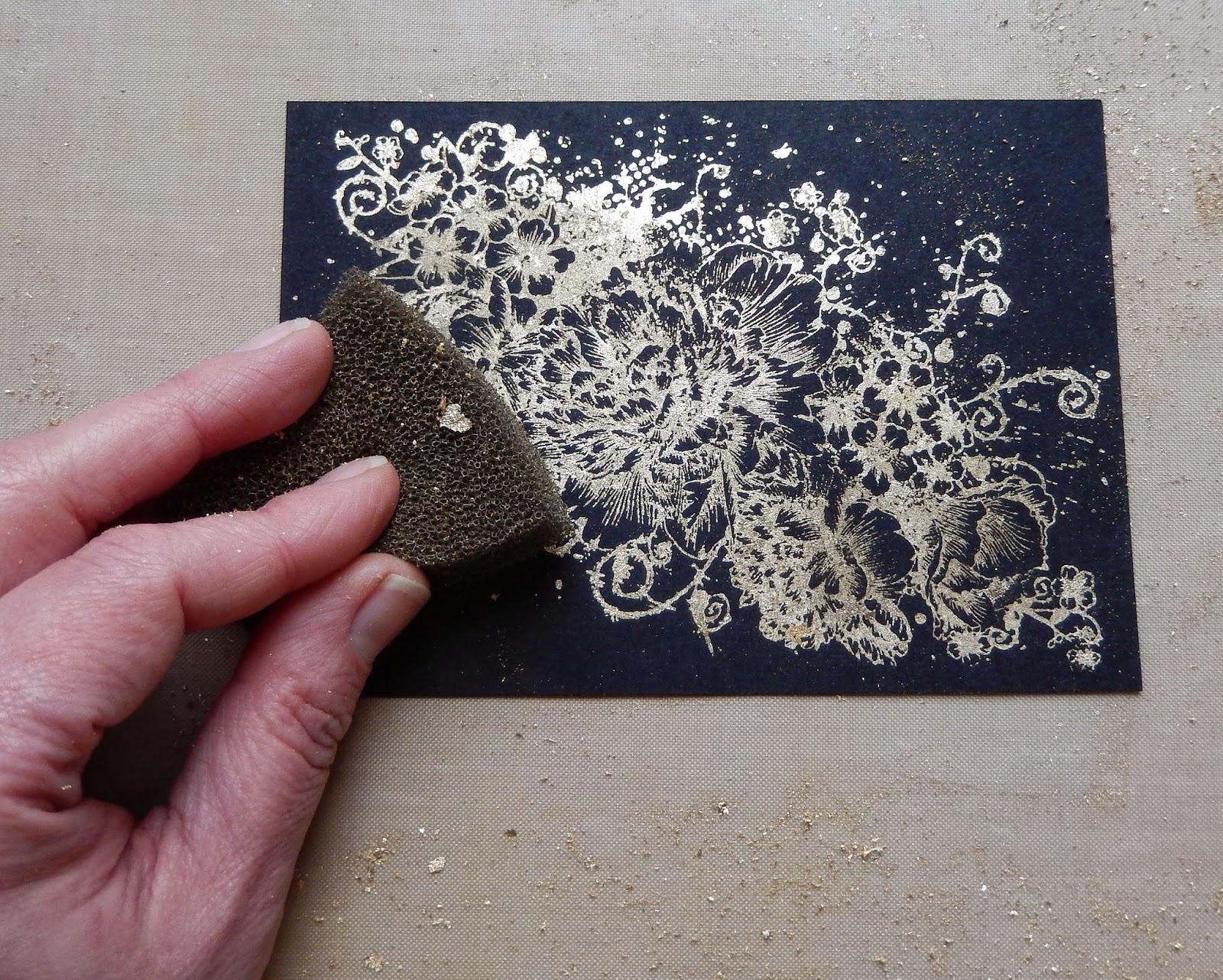 Next I used some Orange Blossom Archival Ink to stamp the pieces with the Ornate Wallpaper background stamp and then embossed them with some clear embossing powder.