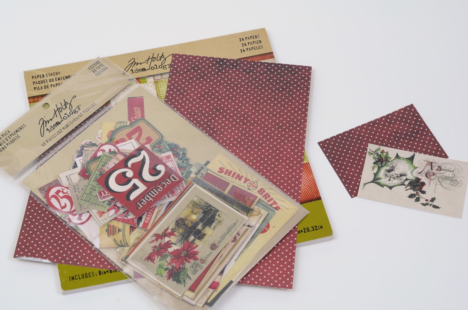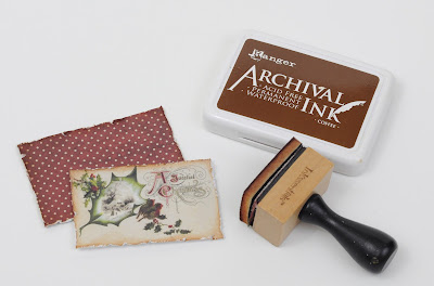 - I pulled a piece from the new Tim Holtz Festive Ephemera Pack and then I cut a backing from the Tim Holtz Yuletide Mini Paper Stash, just a quarter inch around for the frame. I inked the edges with Ranger Archival ink Coffee and then distressed them a bit for a vintage look.