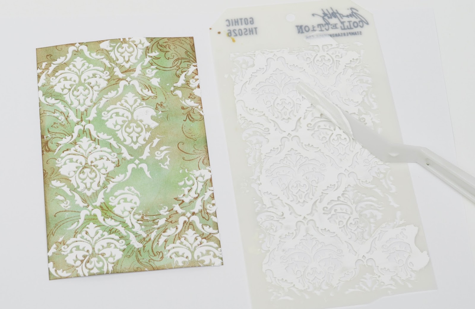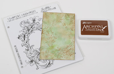 - I coloured a small panel with Ranger Archival inks Coffee and Olive, then I stamped the Fabulous Flourishes using Coffee Archival ink. I used the Gothic stencil and some texture paste to lay down a pattern and while the paste was still wet, I covered it with Rock Candy dry Distress Glitter.