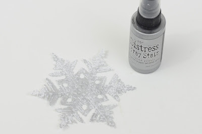 - I cut out and embossed a snowflake using the Sizziz Bigz Layered Snowflake die/embossing folder set, then I spritzed it with Distress Spray Brushed Pewter. I wanted a more white gold sort of look, so I dulled it down with a touch of Coffee Archival ink.