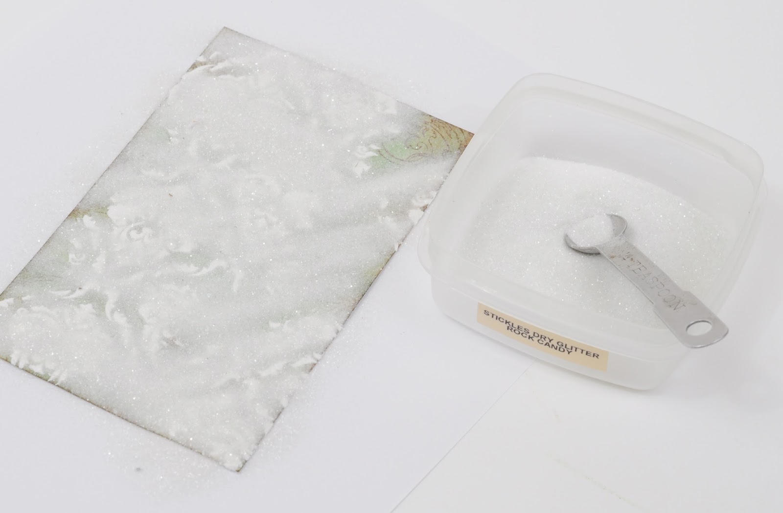 - The last stage is to use some thick Gesso, Modelling Paste or Ranger Texture Paste and apply it randomly over the previously sponged areas. Put it on nice and thick to create snowy peaks and while it's wet, toss on a little Rock Candy Distress Glitter for some added sparkle! Presto, a snow covered card!