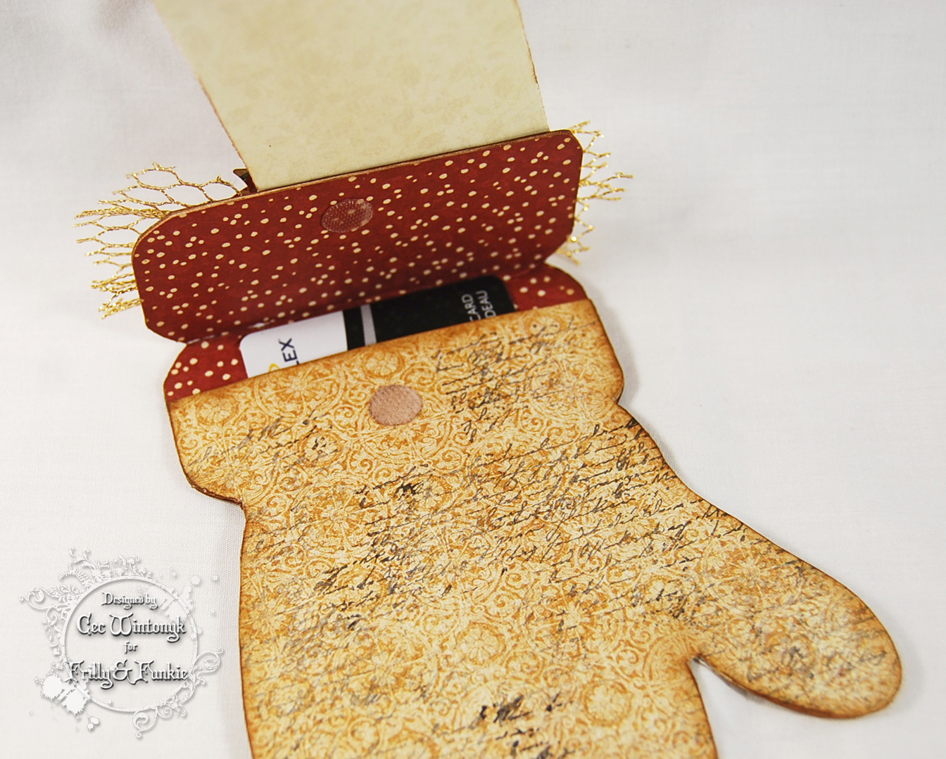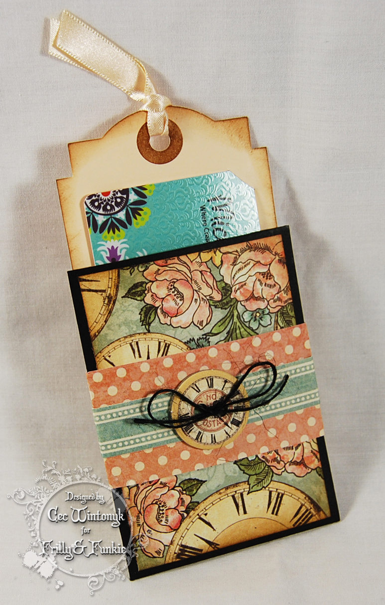 Finally I made a little tag style holder using papers from A Ladies Diary collection. I cut a tag from a scrap of card stock with a fancy die cut for the top. I am not showing you exact measurements for this one because it depends on the size of your gift card. Your tag should be long enough that 3/4" shows above the pocket and the gift card is completely hidden.