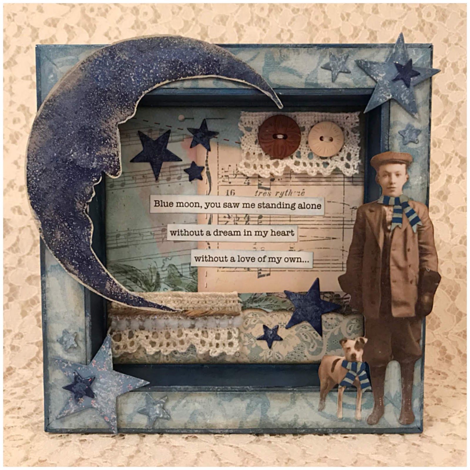 Our final choice of overall winner this time was #8 Melissa (Milliemade) who made this wonderful shadow box inspired by the song Blue Moon. Congratulations to Melissa on being our favorite and winning the opportunity to be a Guest Designer here at Frilly and Funkie for a future challenge. You will be contacted with all the details.