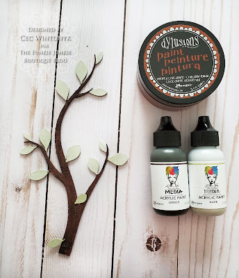 • Cover a couple branches made from a cracker box with some Texture Paste (Ranger) and then paint with a mixture of Umber Acrylic Paint (Dina Wakley) and Melted Chocolate Acrylic Paint (Dylusions) and combine to make one more dense branch