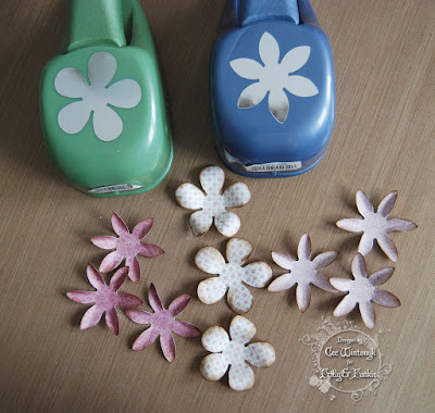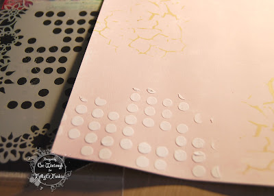 The flowers were painted with ranger paint. After the paint dried, embossing paste was applied using the mini layering stencil to create a polka dot effect.