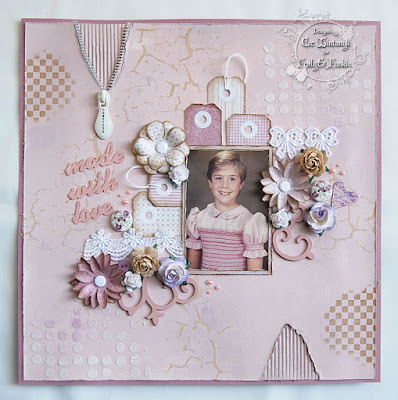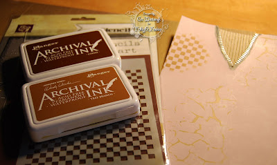The Wendy Vecchi squares stencil was used to apply crackle embossing paste over the background. While the embossing paste was wet a layer of tarnished brass and raspberry distress stains were sprayed and mixed with water over the surface.