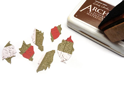 Next I cut some leaves out of a striped page from the Tim Holtz Yuletide paper pad and edged them with Potting Soil.