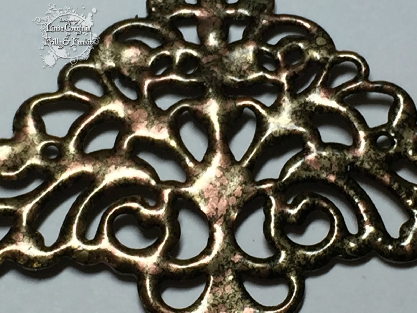 This is Fossilized Amber Distress Oxide ink over the manila tag using the Tim Holtz Flourish stencil. The embossing powder is Burnt Copper Leaves. Below, I have taken an ordinary bronze filigree metal and embossed it with the Burnt Copper Leaves.