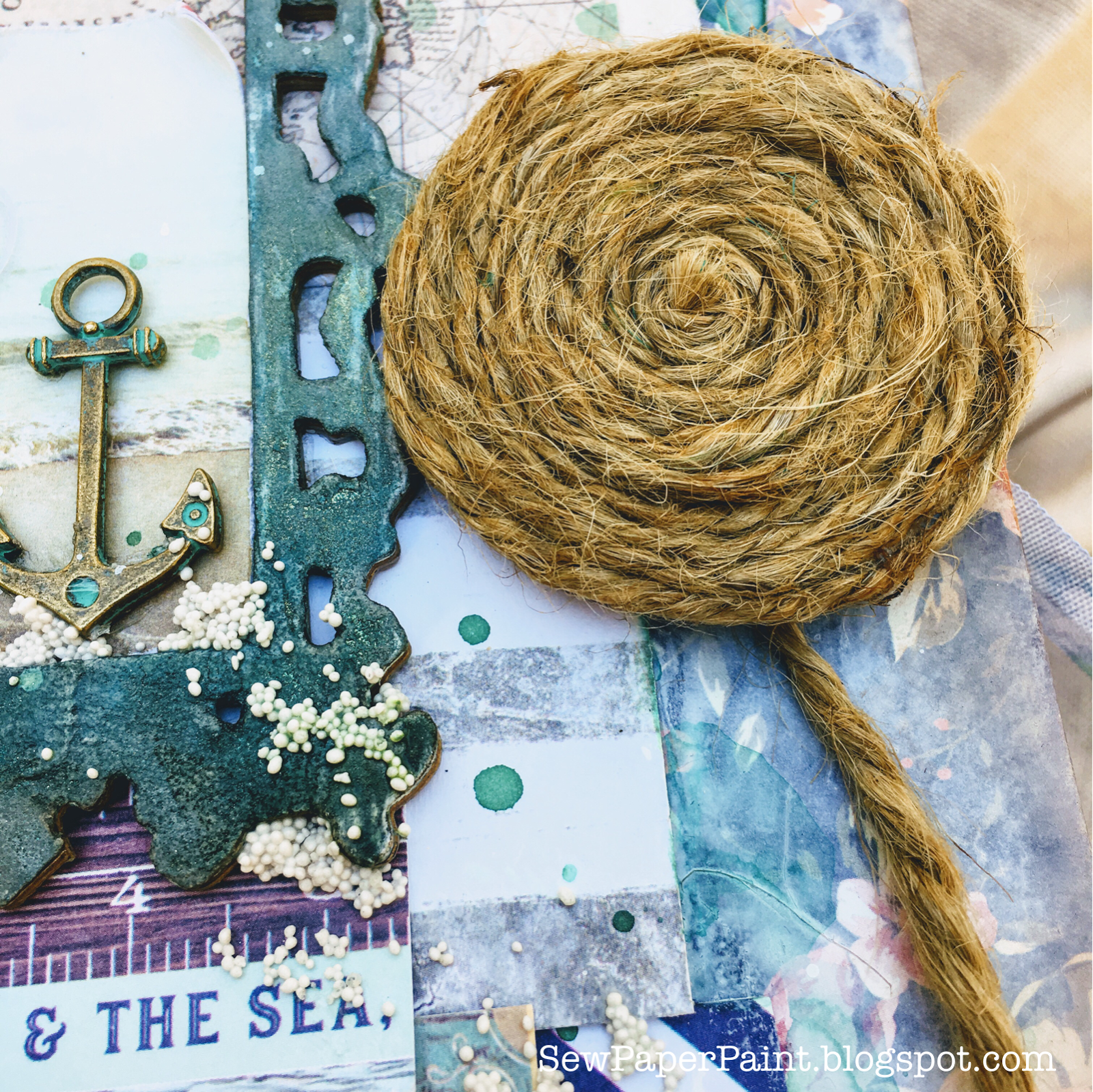 There are several collage sheets in the collection and I used them to build multiple layers on each page. For my cover, I cut four Ornate Frame dies from thin chipboard and layered together to make a substantial focal embellishment. I used one of the collage images, an anchor charm and added some Mini Art Stones to mimic sand.