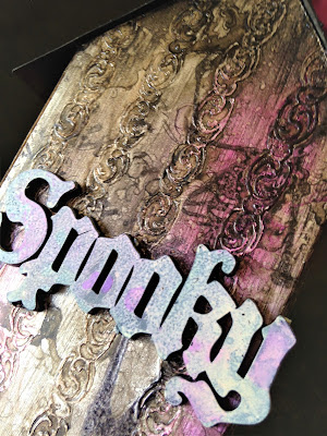 4. Sponge or paint Black Soot Distress paint over the entire metallic surface. Again you can go heavy or light, depending on your preference. While the paint is still wet, spritz with water either lightly or heavily depending on how much 'swirling' you want to see.