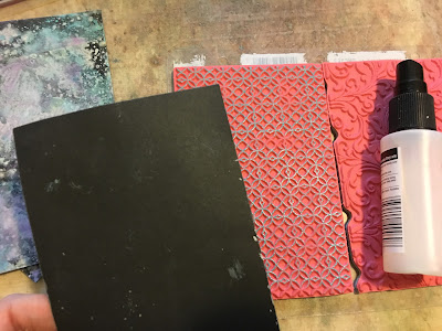 Because Distress Oxides are highly pigmented and oxidize when wet, they work beautifully over dark colored paper. I was anxious to see if I could create even more drama and contrast by adding some watered gesso to my black cardstock before dipping into my color. To do this, I first applied clear gesso to my heavy black cardstock. I then squeezed some white gesso onto my kraft mat and spritzed heavily with water and used a paintbrush to move the color around. I dipped each panel into the mixture and dried.