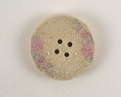 First step is to ink up the face of the button using a watermark ink. After the surface is tacky and ready then you cover the button with clear embossing powder. Heat up the button until the embossing powder melts. While the button is still warm pour crystal glitter over the button.