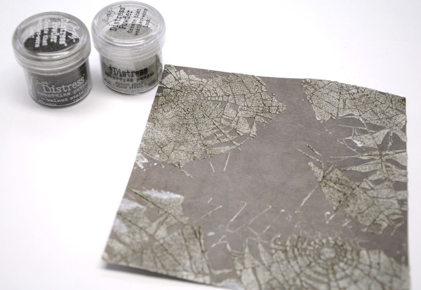 - while the Gesso is still wet, lightly apply Distress embossing powders Pumice Stone and Walnut Stain randomly around your pattern and allow the Gesso to dry before heating with heat gun.