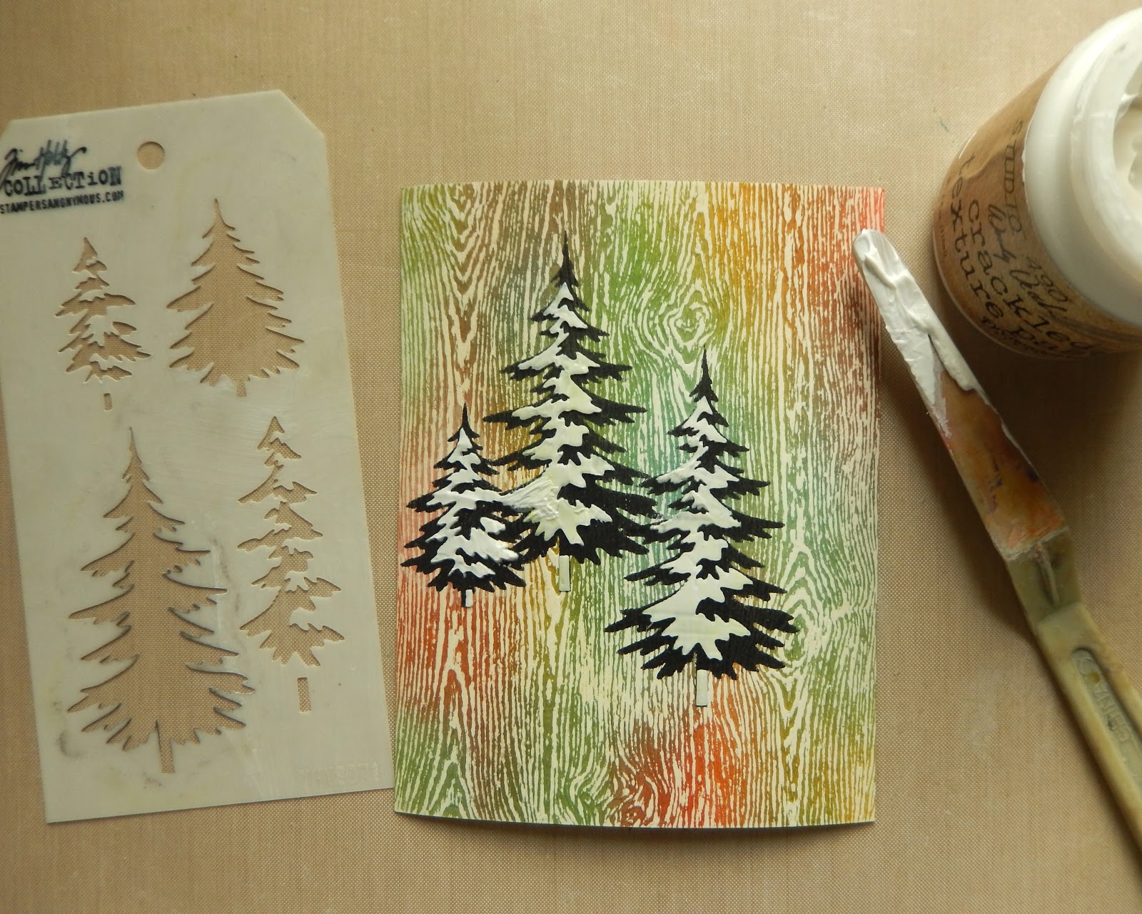Now apply Wendy Vecchi's Crackled Texture Paste through the second layer from the same stencil and allow to air dry. To finish the background I used the smallest amounts of Distress Paint (in the same colours as the inks) to add splatters over the trees.