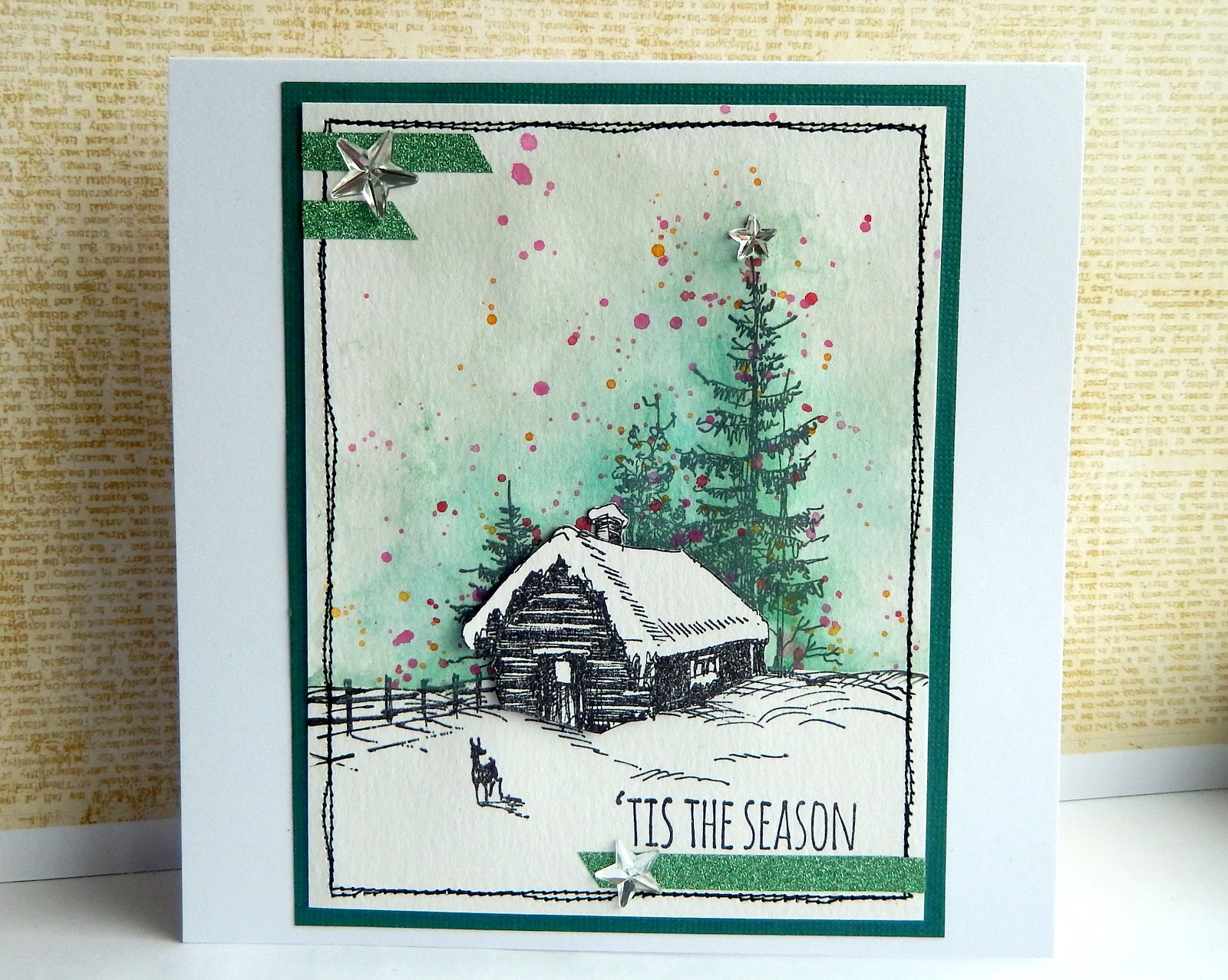 Cut a piece of Distress Watercolor Cardstock 4 1/4 inches by 5 1/2 inches and stamp the log cabin from the Tim Holtz Scribble Woodland across the bottom third using Black Soot Archival Ink (I extended the design with a few lines using a permanent black fineliner pen). Use some washi tape and scrap paper to mask off the design below the snow line. Spritz the uncovered part of the card with water and begin by adding dilute Iced Spruce Distress Paint to most of the background, concentrating particularly around the trees and along the washi tape. Dry with a heat gun.