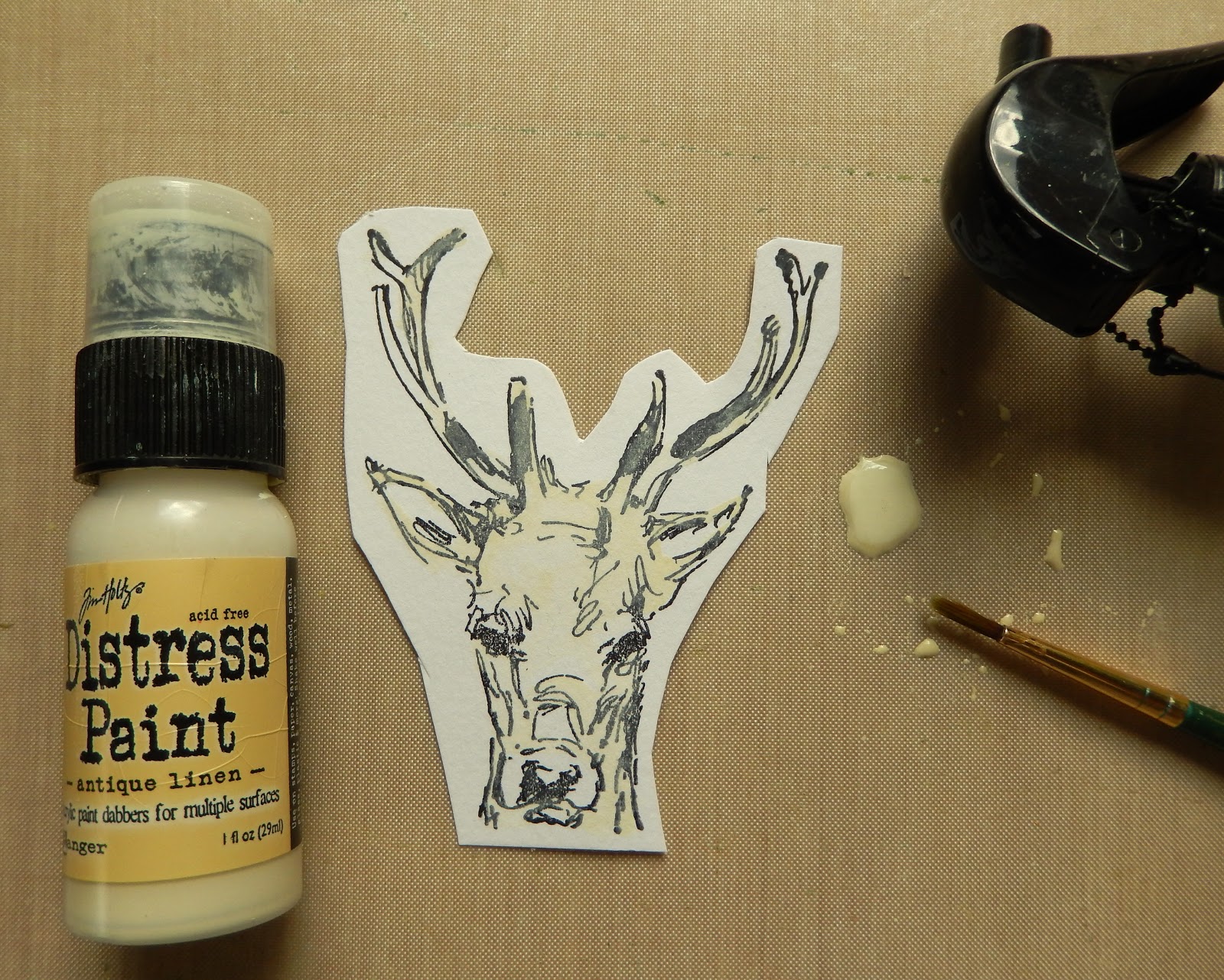 Stamp a reindeer from the Tim Holtz Scribble Woodland set onto Distress Watercolor Cardstock using Black Soot Archival Ink, then paint some areas with a diluted mix of Antique Linen Distress Paint. When dry cut out the reindeer.