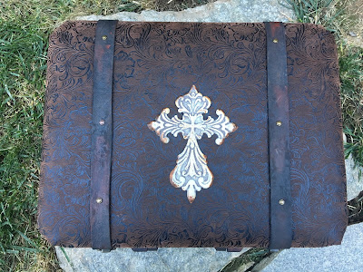 I have created a Vampire Hunting Kit and this is the outside of the kit. I made the "leather straps" out of fun foam, aluminum foil and an iron.