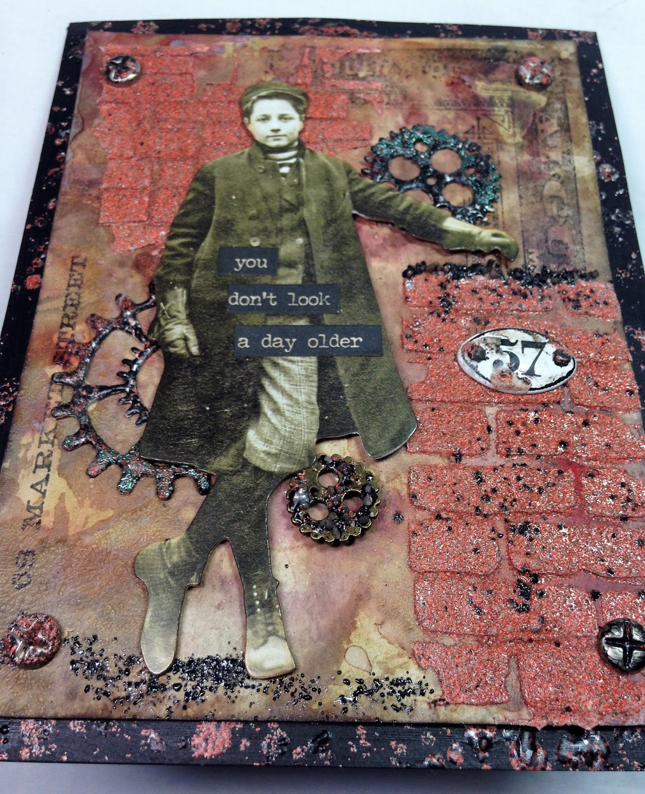 4. (Not shown) I ran a line of collage medium along the top of the lower bricks and sprinkled with Rocky Road. I wanted this to look like a half wall my chap was leaning on. I also added a bit where his feet would be for something for him to stand on.