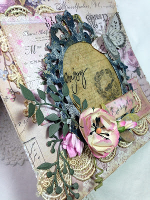 7. To give it a shabby appearance and to better blend with the gorgeous Prima Lavender papers, I sponged on some chalky paint randomly.