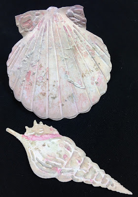For each of these shells, I used the new Seashells Bigz die by Tim Holtz and the Texture Fade which is included. I used various papers including Distress Heavystock, Distress Watercolor Cardstock, Idea-ology Metallic Kraft Stock, Alcohol Ink Yupo Paper in white, and scraps from my stash. For most of my samples, I applied gesso to the shells before adding any products. I did not use gesso with Yupo or Metallic card, and I didn't use it for the blue shell that I used Distress ink alone to color. Most of my shells are shaped, and I did this by first spritzing the back with water, shaping and then drying with a heat tool.